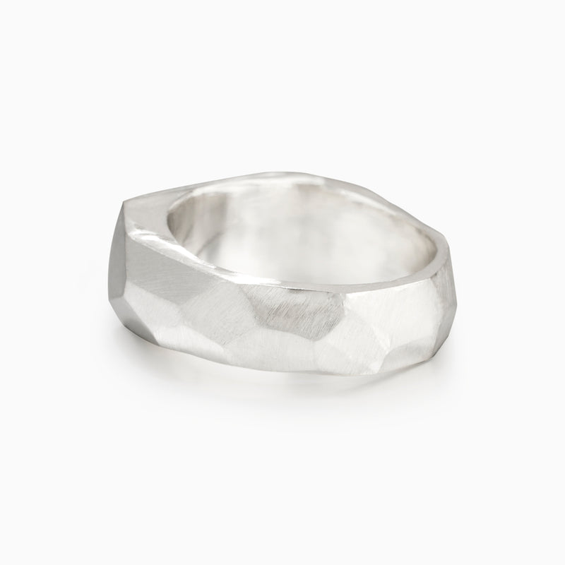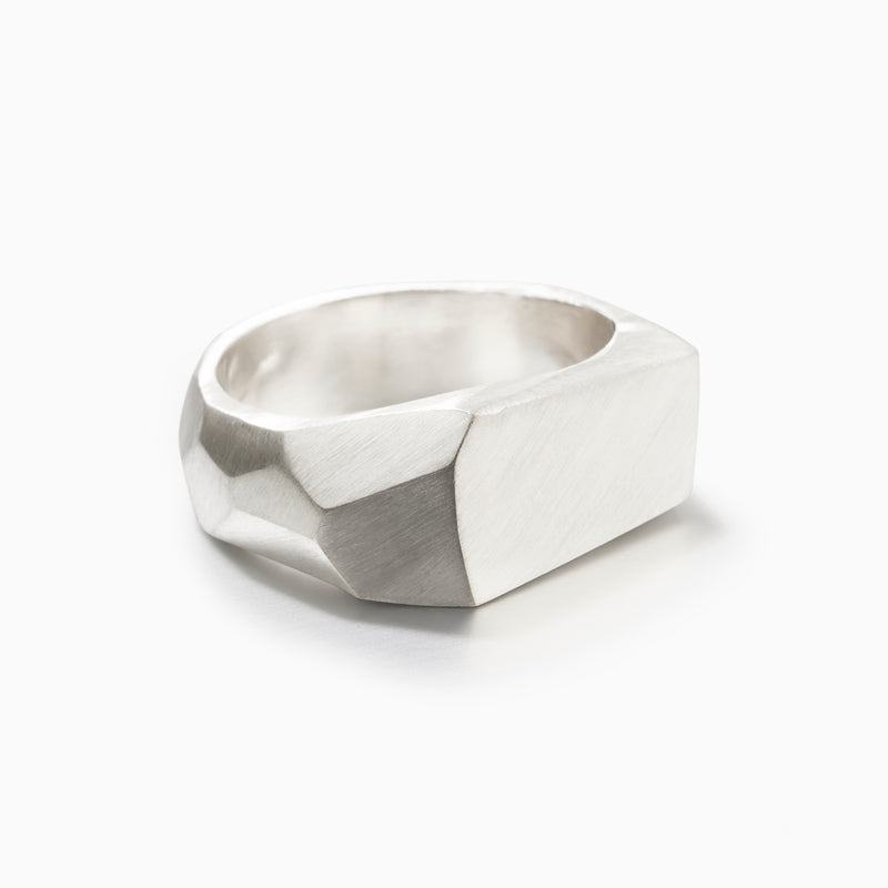 A ring defined by contrast. Angled, faceted planes define the look and creates movement without excess detail.