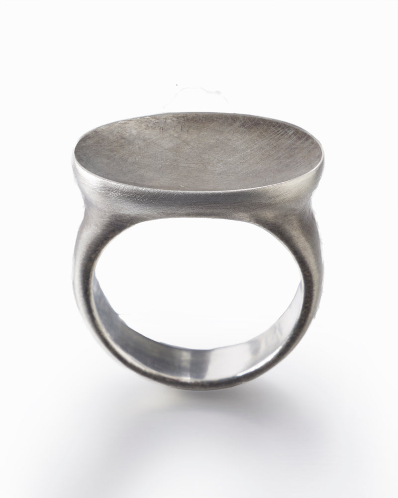 A solid silver ring formed in a subtle convex rise and finished with a hand-brushed texture. Designed to settle onto the hand with quiet weight and balance.