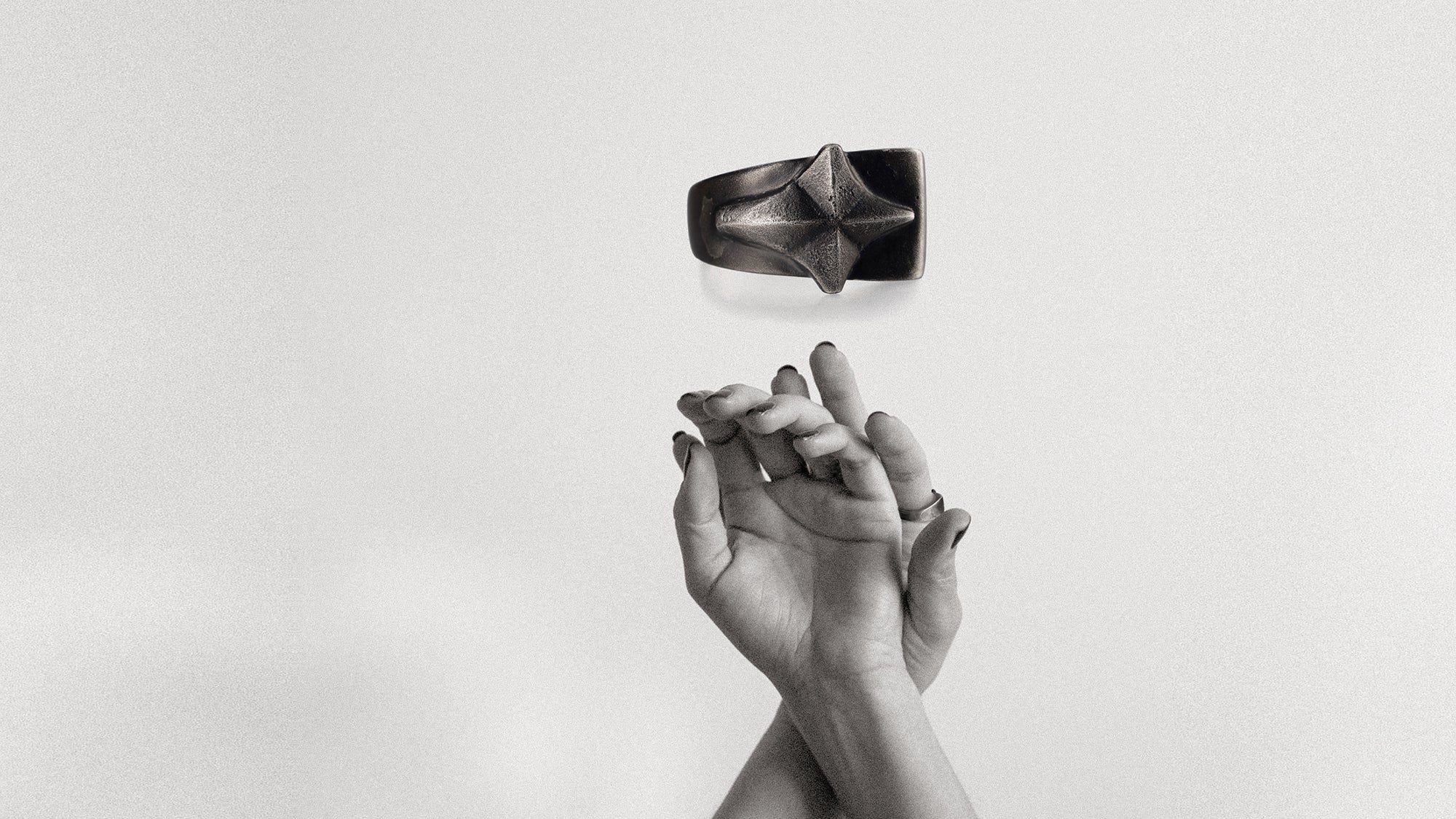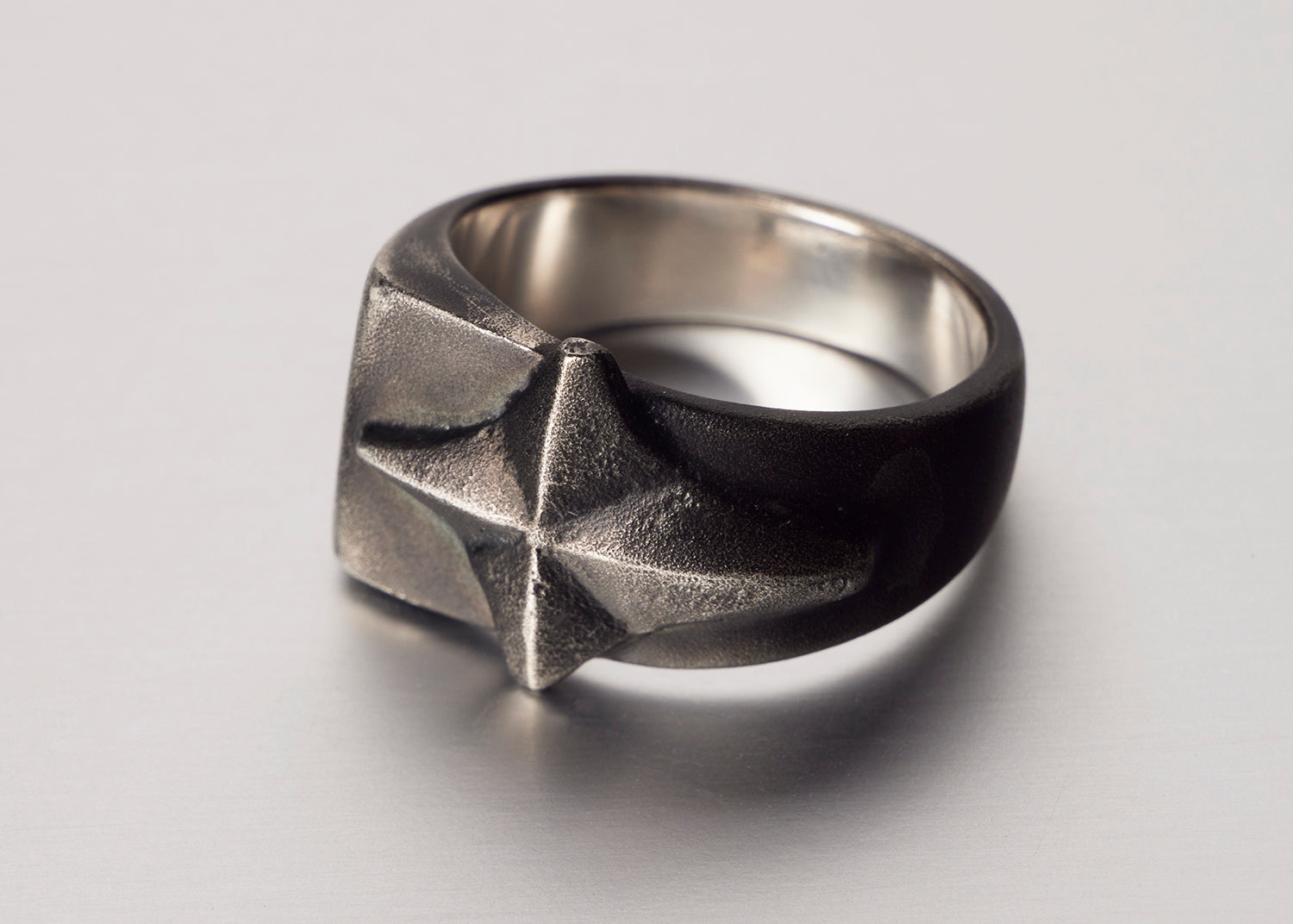 Hand carved four point star on a unique asymmetrical band. Ruthenium plating applied meant to wear with time.